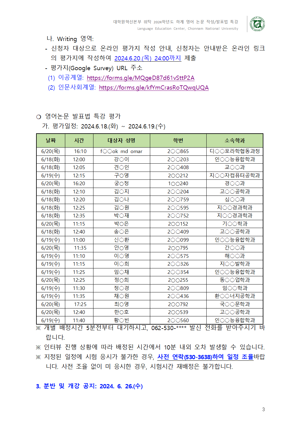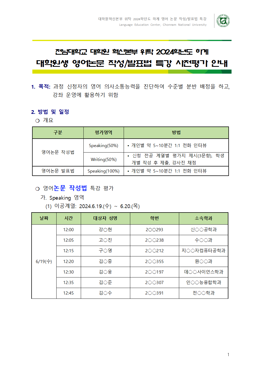 게시판 언어교육원 소개 외국어강좌 한국어강좌 특별강좌 강좌접수 게시판 영어학습센터 공지사항 공지사항 강좌소식 Q & A 특강제안하기 채용공지 영문교정 게시판 공유하기 복사 공지사항 2024학년도 하계 대학원생 영어논문 작성/발표법 특강 사전평가 안내 작성자 관리자2(lec) 작성일 2024-06-17 조회 807 첨부파일 #1 image001.png[ 다운로드 : 177 ] 65KB첨부파일 #2 image002.png[ 다운로드 : 137 ] 86KB첨부파일 #3 image003.png[ 다운로드 : 140 ] 99KB첨부파일 #4 2024학년도 하계 대학원생 영어논문 작성, 발표법 특강 사전평가 안내문.pdf[ 다운로드 : 225 ] 2MB . 목록
