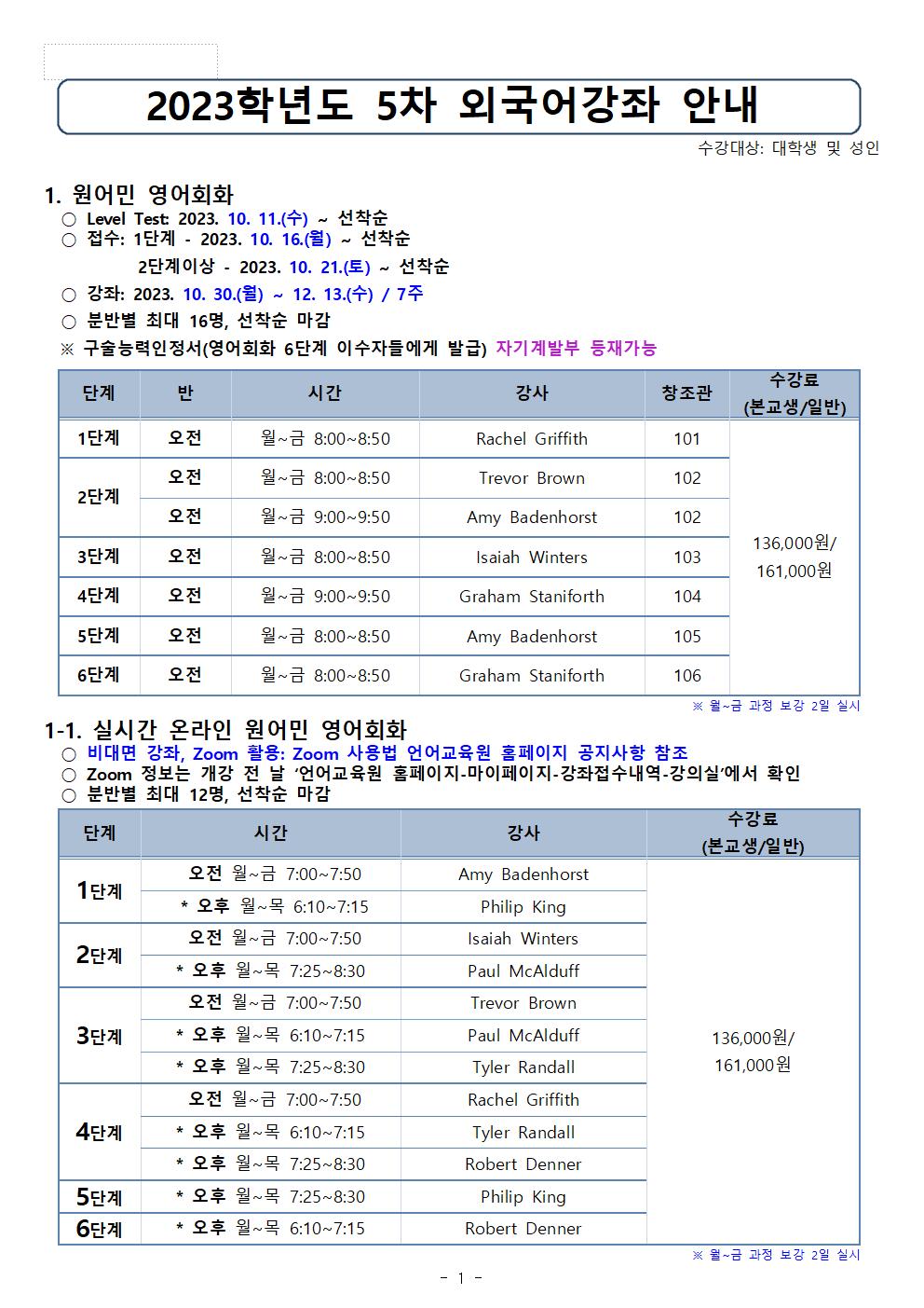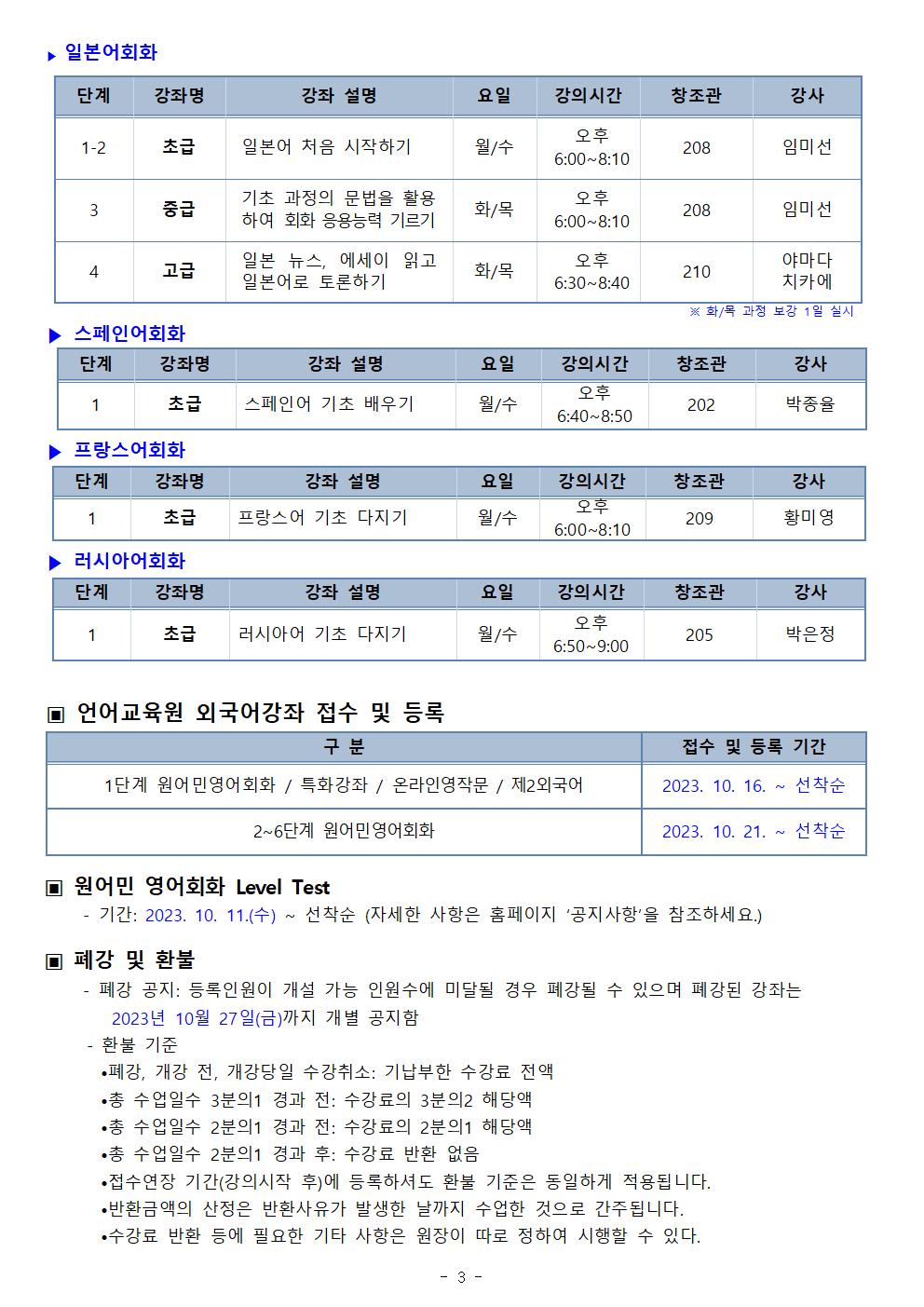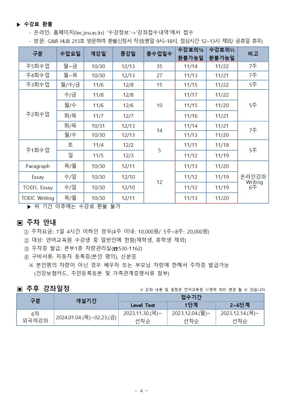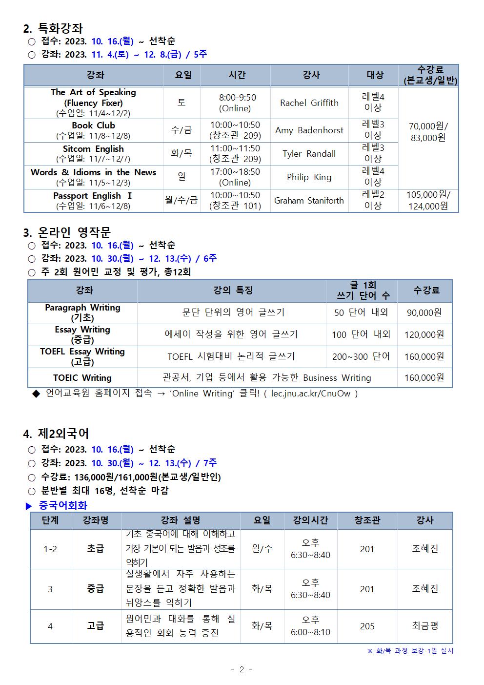 게시판 언어교육원 소개 외국어강좌 한국어강좌 특별강좌 강좌접수 게시판 영어학습센터 공지사항 공지사항 강좌소식 Q & A 특강제안하기 채용공지 영문교정 게시판 공유하기 복사 공지사항 2023학년도 5차 외국어강좌 안내 작성자 관리자2(lec) 작성일 2023-10-04 조회 2824 첨부파일 #1 2023 5차 외국어강좌안내[전남대학교 언어교육원]001.jpg[ 다운로드 : 422 ] 208KB첨부파일 #2 2023 5차 외국어강좌안내[전남대학교 언어교육원]002.jpg[ 다운로드 : 269 ] 207KB첨부파일 #3 2023 5차 외국어강좌안내[전남대학교 언어교육원]003.jpg[ 다운로드 : 251 ] 195KB첨부파일 #4 2023 5차 외국어강좌안내[전남대학교 언어교육원]004.jpg[ 다운로드 : 222 ] 184KB첨부파일 #5 2023 5차 외국어강좌안내[전남대학교 언어교육원].pdf[ 다운로드 : 441 ] 172KB . 목록
