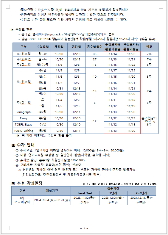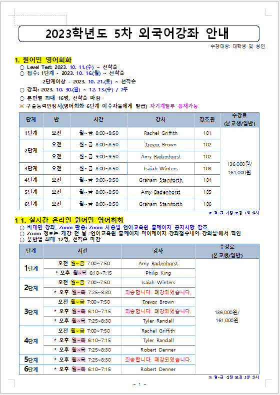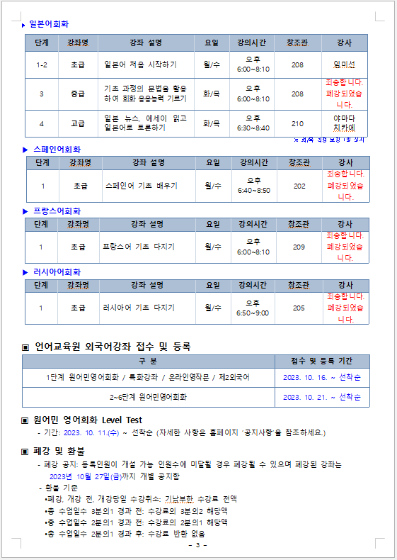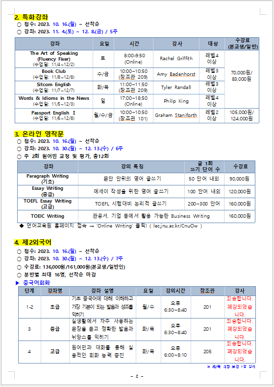 게시판 언어교육원 소개 외국어강좌 한국어강좌 특별강좌 강좌접수 게시판 영어학습센터 공지사항 공지사항 강좌소식 Q & A 특강제안하기 채용공지 영문교정 게시판 공유하기 복사 공지사항 2023학년도 5차 외국어강좌 개폐강 안내 작성자 관리자2(lec) 작성일 2023-10-26 조회 1476 첨부파일 #1 5차_1.png[ 다운로드 : 232 ] 65KB첨부파일 #2 5차_2.png[ 다운로드 : 186 ] 71KB첨부파일 #3 5차_3.png[ 다운로드 : 224 ] 55KB첨부파일 #4 5차_4.png[ 다운로드 : 193 ] 57KB . 목록