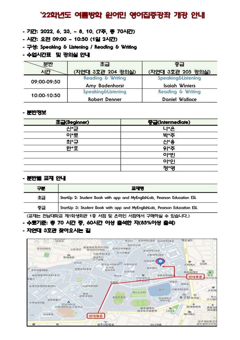 게시판 언어교육원 소개 외국어강좌 한국어강좌 특별강좌 강좌접수 게시판 영어학습센터 공지사항 공지사항 강좌소식 Q & A 특강제안하기 채용공지 영문교정 게시판 공유하기 복사 공지사항 2022학년도 여름방학 영어집중강좌 개강안내 작성자 관리자2(lec) 작성일 2022-06-21 조회 2228 첨부파일 #1 22S IEP 안내문_1.jpg[ 다운로드 : 363 ] 199KB첨부파일 #2 22S IEP 안내문.pdf[ 다운로드 : 439 ] 154KB . 목록