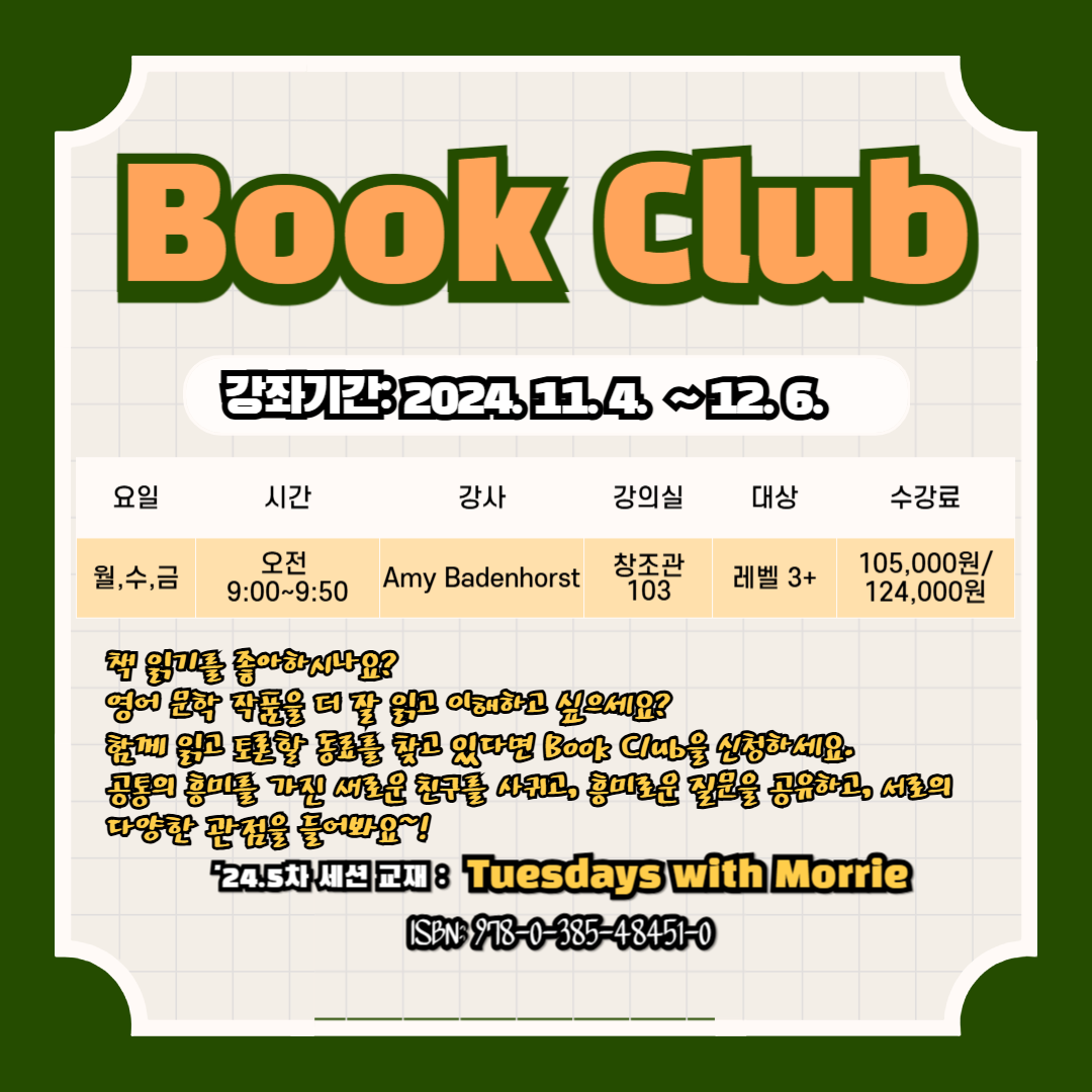 게시판 언어교육원 소개 외국어강좌 한국어강좌 특별강좌 강좌접수 게시판 영어학습센터 강좌소식 공지사항 강좌소식 Q & A 특강제안하기 채용공지 영문교정 게시판 공유하기 복사 강좌소식 [2024.5차 외국어강좌] 특화강좌_Book Club 작성자 관리자2(lec) 작성일 2024-10-18 조회 595 첨부파일 #1 001.png[ 다운로드 : 286 ] 319KB첨부파일 #2 LEC Book Club Syllabus October 2024.pdf[ 다운로드 : 298 ] 134KB . 목록
