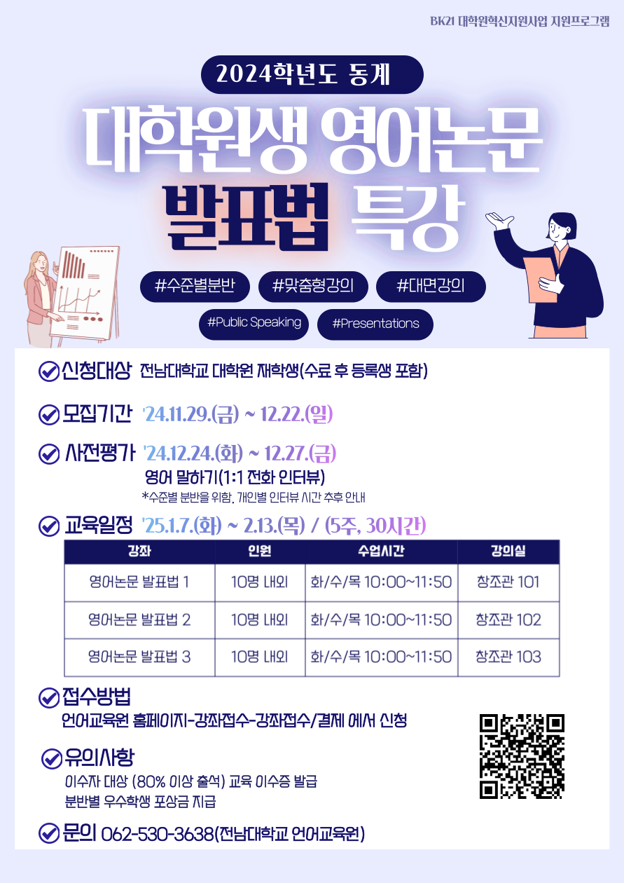 게시판 언어교육원 소개 외국어강좌 한국어강좌 특별강좌 강좌접수 게시판 영어학습센터 강좌소식 공지사항 강좌소식 Q & A 특강제안하기 채용공지 영문교정 게시판 공유하기 복사 강좌소식 [CNU 대학원생 대상 무료강좌] 동계 대학원생 영어논문 발표법 특강 작성자 관리자2(lec) 작성일 2024-11-29 조회 719 첨부파일 #1 발표법 특강 홍보물.png[ 다운로드 : 332 ] 355KB첨부파일 #2 대학원생 영어논문 발표법 특강 신청 안내문_2024학년도 동계.pdf[ 다운로드 : 361 ] 2MB ☞ 강좌접수 바로가기 링크: https://lec.jnu.ac.kr/Course/Course100.aspx 목록