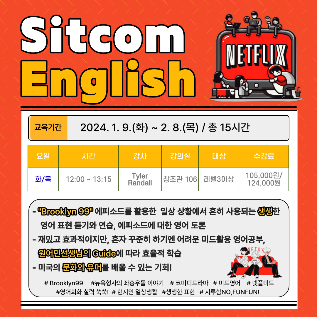 게시판 언어교육원 소개 외국어강좌 한국어강좌 특별강좌 강좌접수 게시판 영어학습센터 강좌소식 공지사항 강좌소식 Q & A 특강제안하기 채용공지 영문교정 게시판 공유하기 복사 강좌소식 [2023학년도 겨울방학 영역별 특화강좌] Sitcom English 작성자 관리자2(lec) 작성일 2023-12-04 조회 1049 첨부파일 #1 004.jpg[ 다운로드 : 215 ] 319KB첨부파일 #2 Sitcom English Syllabus_S6_2023_tyler.pdf[ 다운로드 : 304 ] 135KB . 목록