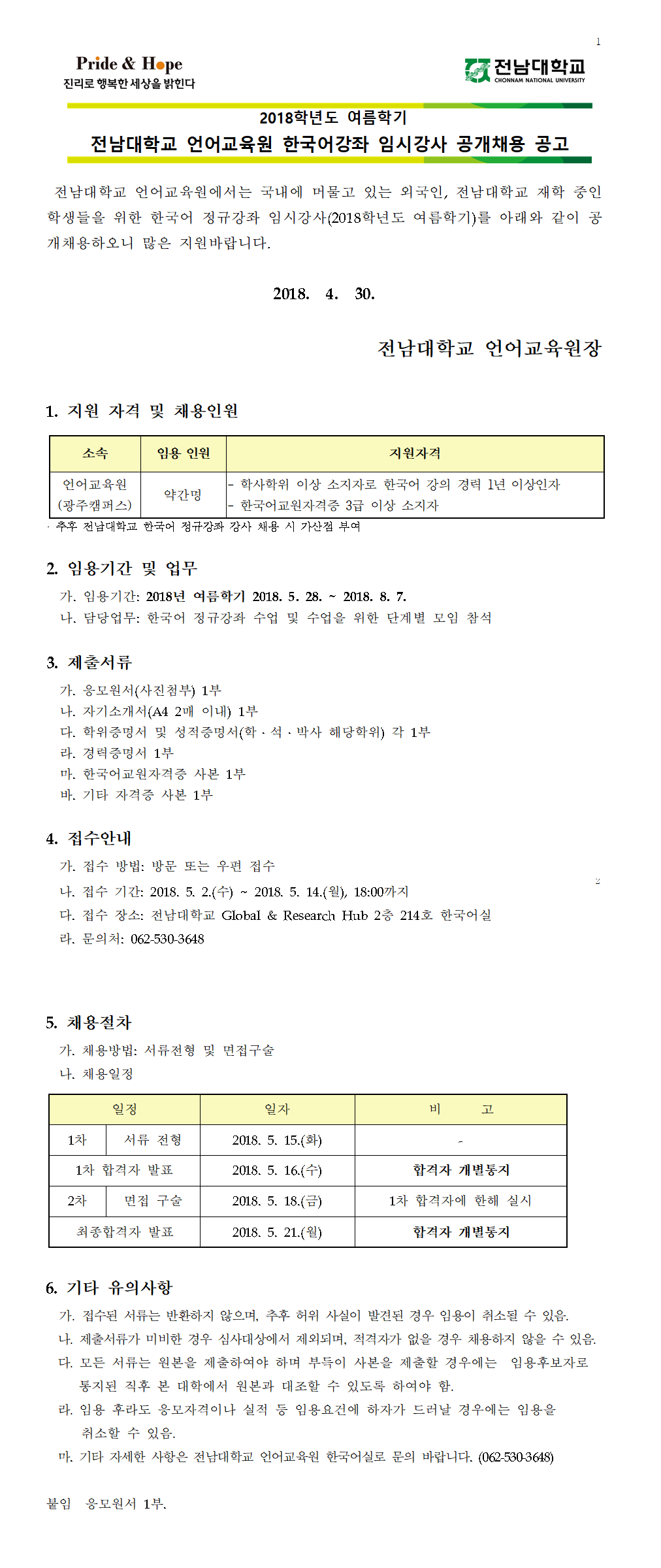 게시판 언어교육원 소개 외국어강좌 한국어강좌 특별강좌 강좌접수 게시판 영어학습센터 채용공지 공지사항 강좌소식 Q & A 특강제안하기 채용공지 영문교정 게시판 공유하기 복사 채용공지 2018 여름학기 한국어강좌 임시강사 공개채용 공고 작성자 관리자2(lec) 작성일 2018-05-02 조회 2094 첨부파일 #1 한국어강좌 임시강사 공개채용 공고문.png[ 다운로드 : 444 ] 146KB첨부파일 #2 2018년 여름학기 전남대학교 언어교육원 한국어강좌 임시강사 공개채용 공고 (1).hwp[ 다운로드 : 667 ] 128KB첨부파일 #3 응모원서_2018년 여름학기 전남대학교 언어교육원 한국어 정규강좌 임시 강사.hwp[ 다운로드 : 533 ] 32KB 목록